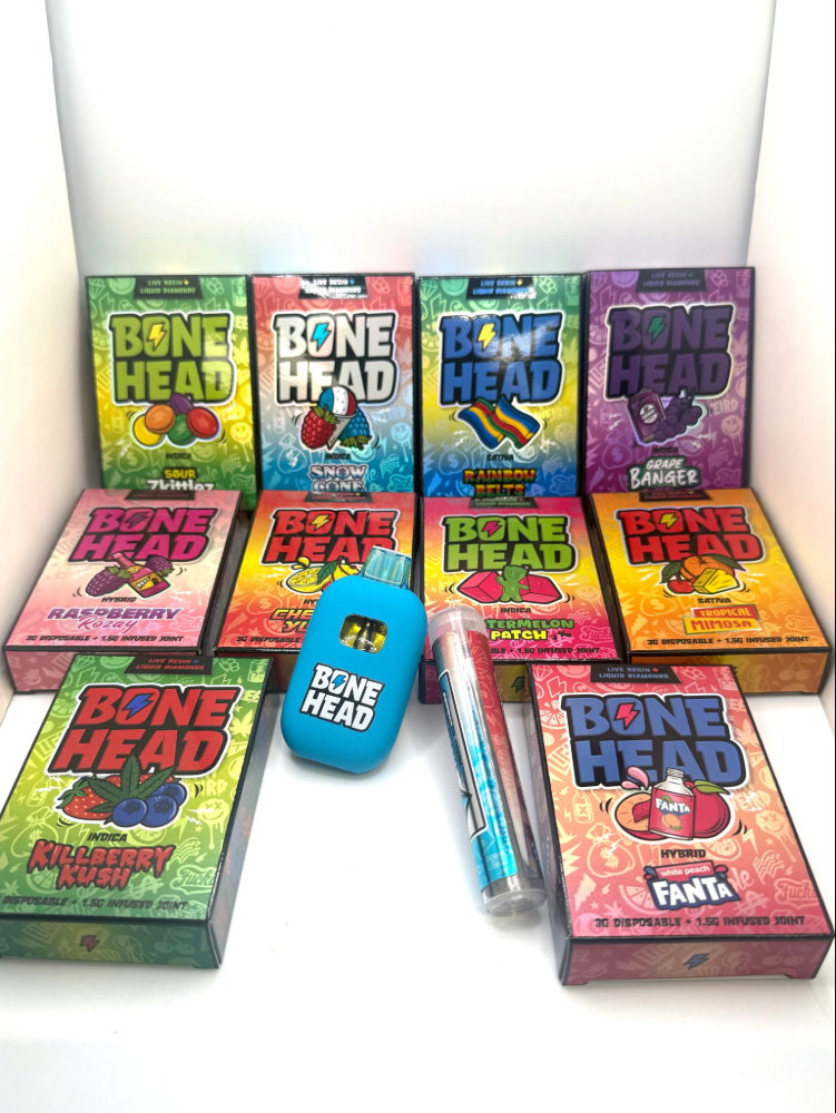 | Bone Head Flavors | Cherry Yuzu-Hybrid, Grape Banger-Indica, Killberry Kush-Indica, Rainbow Belts-Sativa, Raspberry Rozay-Hybrid, Snow Cone-Indica, Sour Zkittlez-Indica, Tropical Mimosa-Sativa, Watermelon Patch-Indica, White Peach Fanta-Hybrid |
