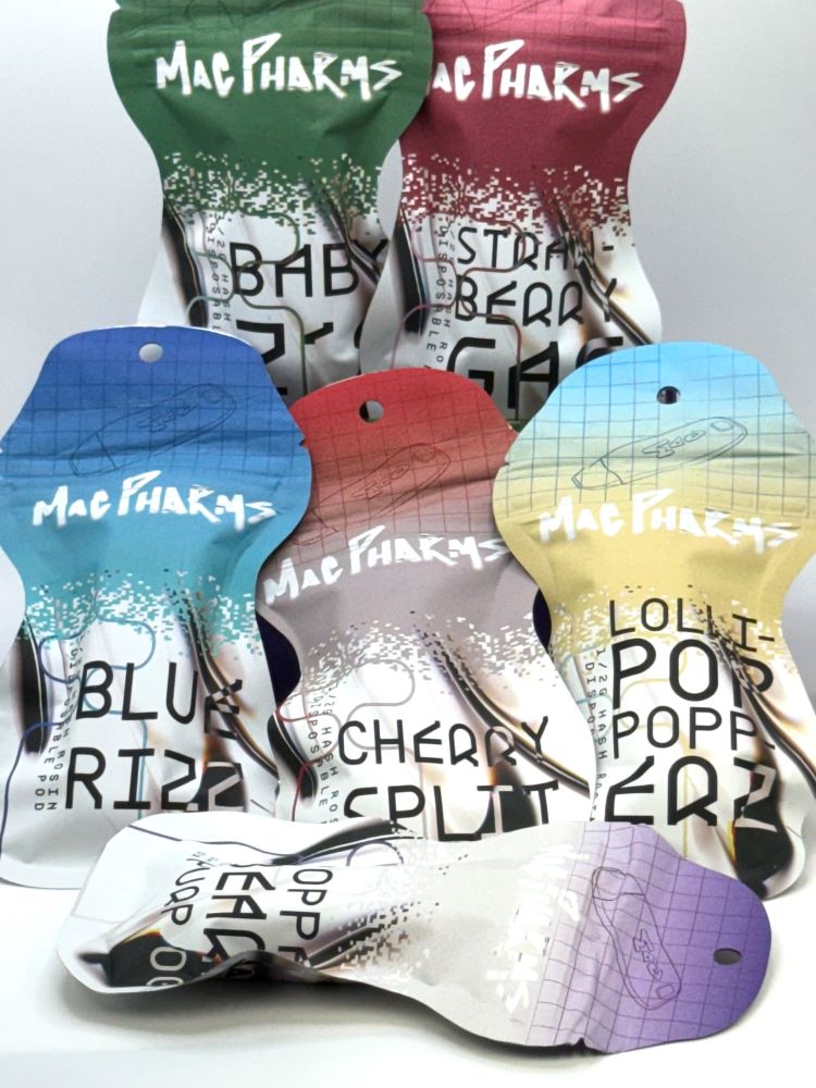 | Mac Pharms Hash Rosin Pens | Baby Z-Indica, Blue Rizz-Hybrid, Cherry Split-Hybrid, Lolli-pop Popperz-Hybrid, Purp OG-Indica, Strawberry Gag-Hybrid |